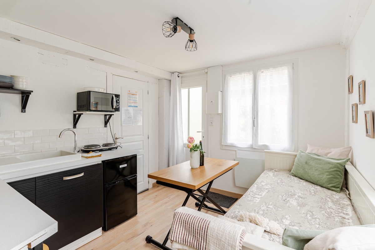 Petite maison de type studio de 23m2 en centre bourg, avec jardin. Venez profitez de quelques jours à la campagne dans ce logement entièrement refait à neuf, au calme et disposant de toutes les commodités nécessaires. Cuisine équipée, coin repas, salon avec canapé lit confortable ( 140*190 cm / matelas 18cm), salle de bain avec douche et WC. Vélos à dispo Possibilité de loger en longue durée 5 min de Lisieux (gare) 5 min du parc zoologique Cerza 30 min de Deauville, Trouville, Honfleur