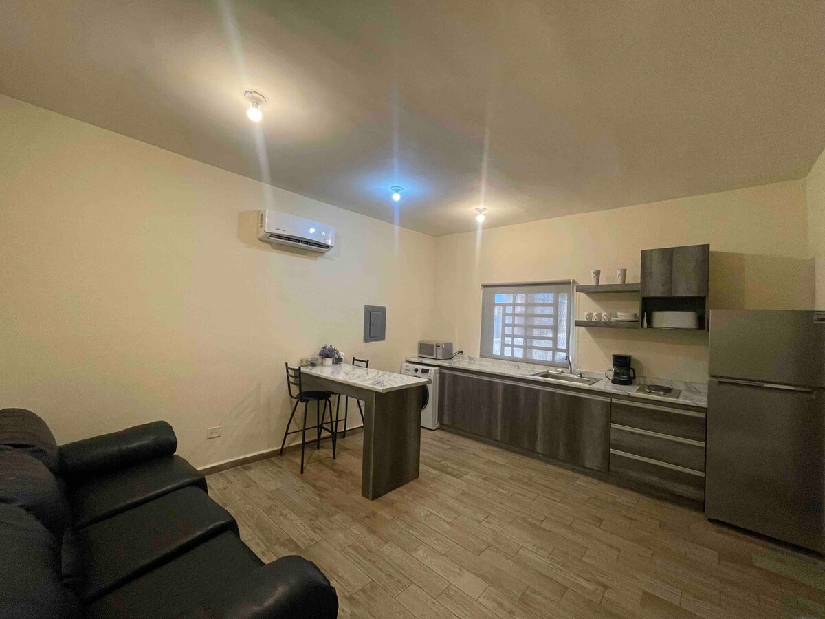 Excelente ubicación, departamento funcional recién construido. equipado para estancias cortas y largas, cuenta con cama matrimonial muy cómoda, cocina con parrilla y frigobar, internet rápido, smart tv, baño completo, agua caliente, estacionamiento afuera de la casa (solo 1 espacio). ¡¡Ubicación muy práctica!! Se encuentra a cuadras del CUM, Plaza Girasol, Walmart, farmacias, IMSS 14, ITH, y a 10 minutos del Aeropuerto y Consulado Americano.