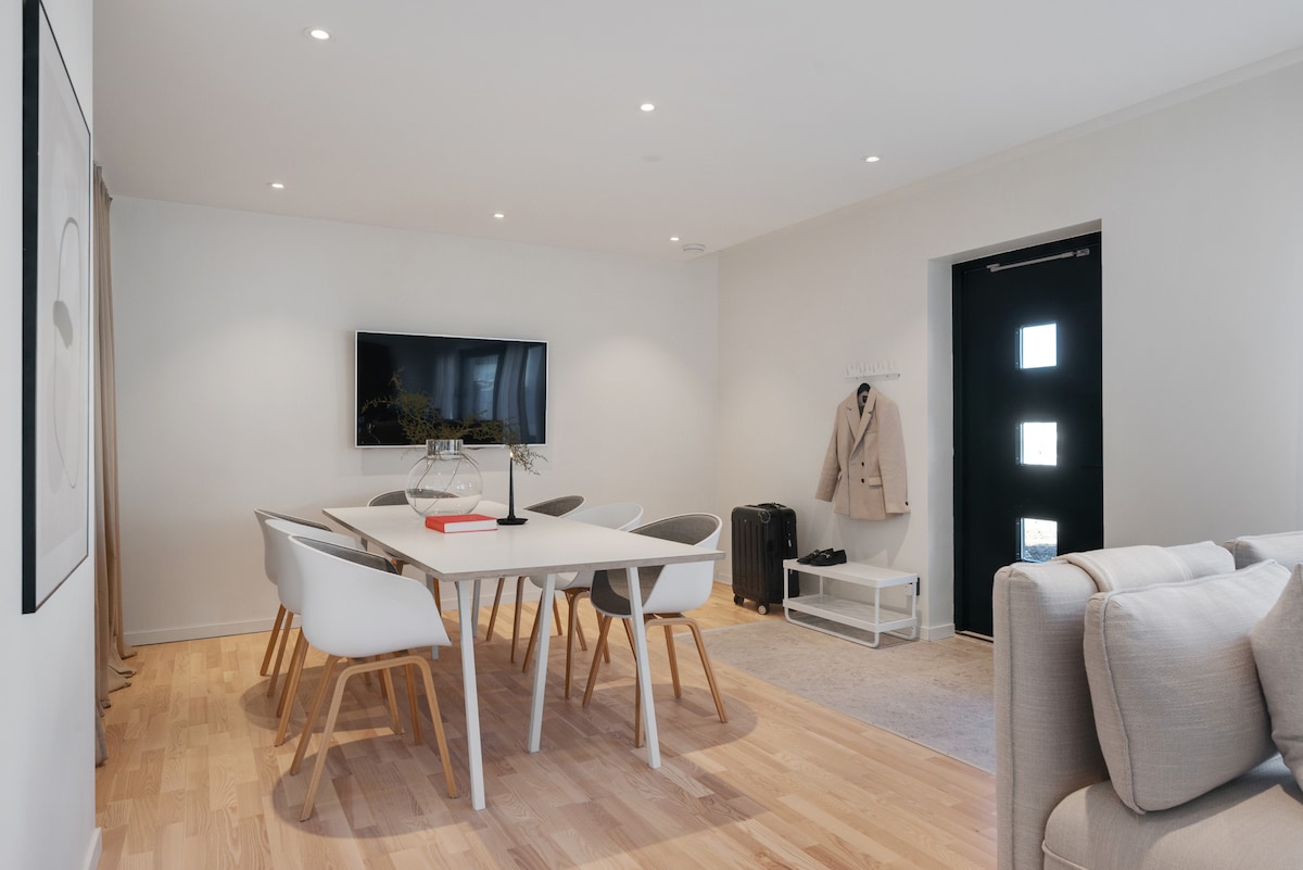 Bienvenue dans une élégante escapade en bord de mer avec vue sur l'océan, un jacuzzi chauffé au bois et un sauna – conçue pour le calme et la détente. Les voyageurs bénéficient d'un accès gratuit à la plage, à la jetée, aux kayaks et au sauna flottant dans un cadre naturel isolé. La Black House dispose de deux chambres, d'une cuisine spacieuse et d'un salon confortable avec cheminée. Le prix de la maison est fixé pour deux personnes. Lorsque vous réservez pour 5 à 6 voyageurs, une maison d'hôtes séparée est également incluse, offrant davantage de confort et d'intimité.