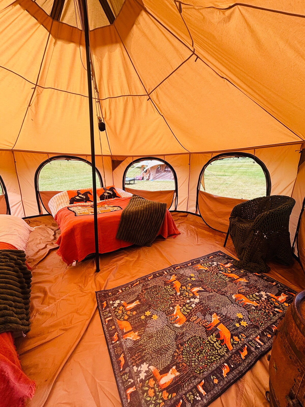 tente cloche avec cuisine extérieure commune avec tout le nécessaire pour cuisiner, barbecue, foyer, lits doubles, lumières, etc. Apportez simplement votre literie, votre charbon de bois, votre bois et vos vêtements ! Toutes les activités de la ferme comprenaient des bateaux, une mini plage de sable dorée près du ruisseau de craie cristalline, 60 acres de rivières boisées de prairies classées de catégorie 1. Rencontrez nos sympathiques ânes, porcelets, promenez-vous dans nos mini chèvres, artisanat , zone boisée de tyrolienne, ramassez les œufs de nos poules et bien plus encore .