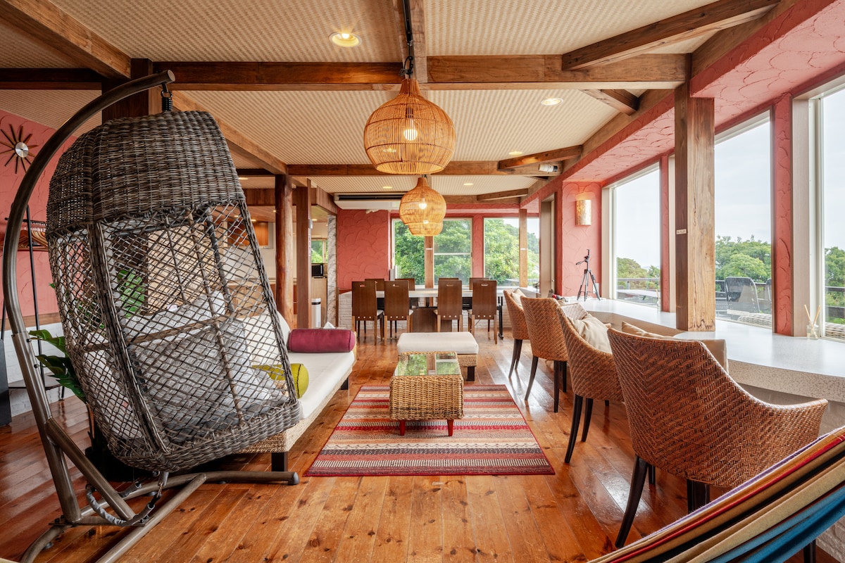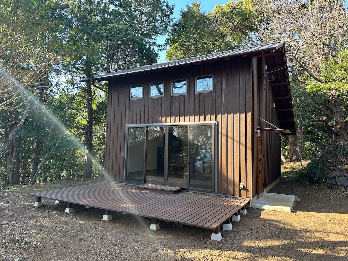 Découvrez les sons extraordinaires de la nature dans un chalet avec vue sur la mer. Il y a un cottage dans le parc national de Tanushi, en passant par le power spot Heart Cave Ryugu (modèle pour « Ponyo » de Ghibli), et la plage de Tanushi. Lorsque vous entrez par la porte d'entrée du chalet, le vert des arbres et la lumière étincelante de l'océan saute dans vos yeux.Le salon de 20 tatamis avec un haut plafond dispose d'un canapé, d'une cuisine, d'un loft et d'une cheminée en hiver, et est un espace de détente pour les familles et les amis. Lorsque vous sortez de la fenêtre vers la terrasse, vous pouvez voir le ciel et la mer s'étendre depuis la mer.Vous pouvez sentir luxueusement la brise confortable et le ciel couler lentement dans le jacuzzi et le hamac. De la terrasse, montez un autre escalier jusqu'à la terrasse sur le toit.Il n'y a que la nature à perte de vue.Le paysage à couper le souffle s'étend à perte de vue. Le flux détendu de la mer et des bateaux de pêche à Izu, vous pouvez entendre le bruit des oiseaux dans le ruisseau.C'est une super désintoxication. Ensuite, descendez d'un étage pour profiter d'un barbecue au charbon de bois tout en écoutant le babillage de la rivière dans la forêt.C'était délicieux, amusant et un excellent souvenir. La nuit, le ciel étoilé est éblouissant, et si le temps est bon, vous pouvez voir des étoiles filantes !Vous pouvez profiter de la beauté du ciel.