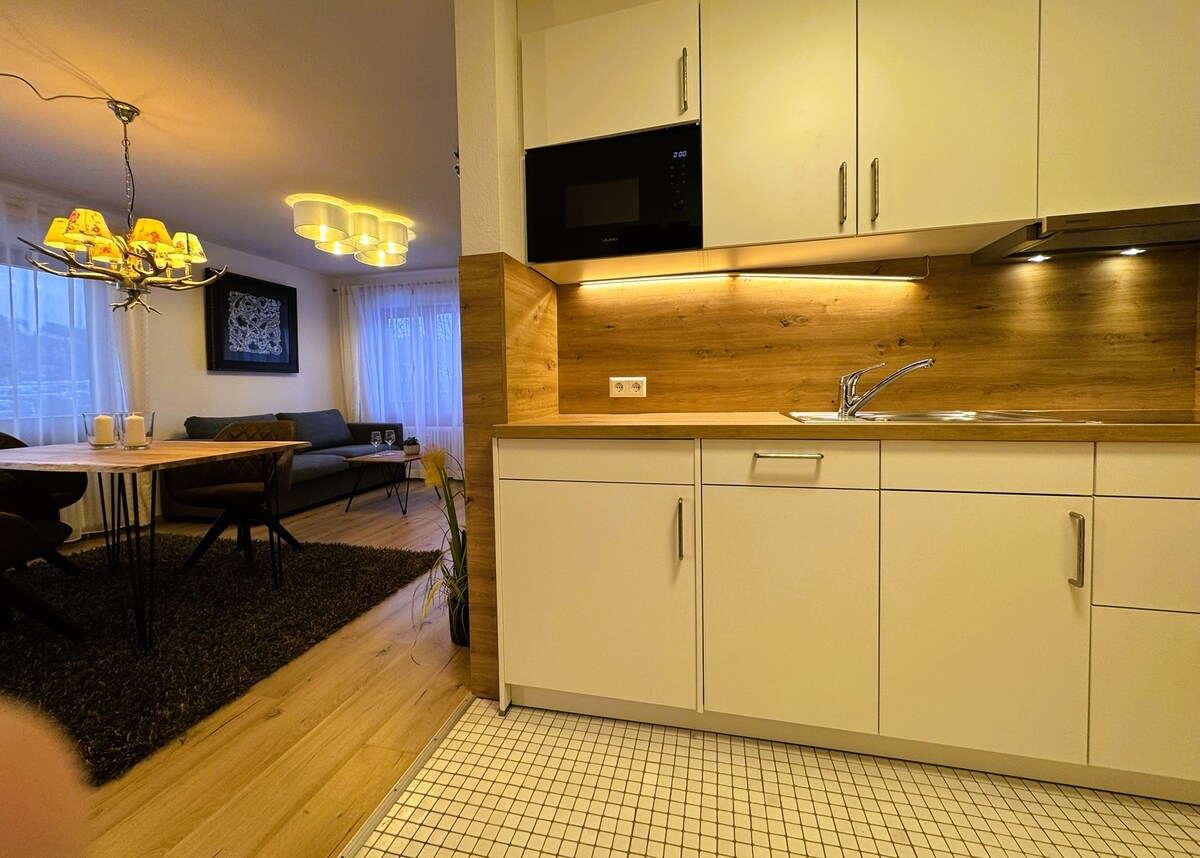 Petit nuage avec balcon sud, soigné, élégant et cool. 2-3 personnes, 1 chambre avec lit double (180x200cm), 1 canapé-lit de haute qualité avec matelas (140x200cm) dans le salon-salle à manger, 1 salle de bains Le petit appartement meublé individuellement séduit par son atmosphère chaleureuse. Depuis le salon-salle à manger, la vue sur le balcon sud s'ouvre sur la Forêt-Noire.
