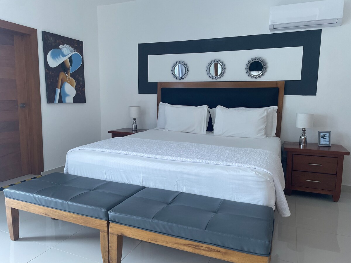4 chambres avec salle de bain privée, dans une villa de luxe, accès direct à la plage. 2 piscines, eau salée et eau douce, jacuzzi, bar et salons, jardin tropical.billard, 2 télévisions avec sky et CLARO ; quartier très calme pour se détendre.Wifi inclus, coffre-fort, climatisation, ventilateur, petit déjeuner inclus, vous pouvez utiliser 3 BBQ, cuisine avec réfrigérateur, cuisinière, micro-ondes, nous pouvons louer plus de chambres. Les enfants de plus de 5 ans sont considérés comme des adultes