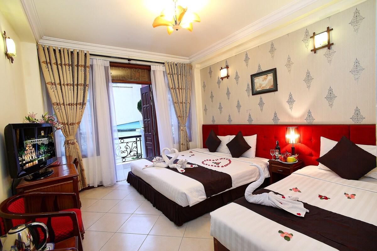 Chambre familiale avec un lit queen size et un petit lit double. Chambre lumineuse avec balcon pour que vous puissiez vous y tenir debout pour profiter du vent et voir le toit supérieur du vieux quartier de la rue de Hanoï.