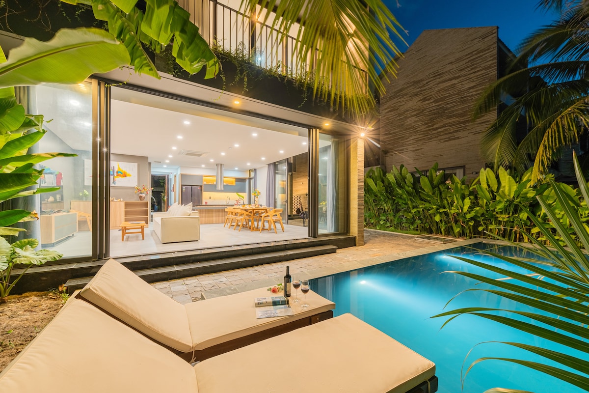 🎁 Une villa récemment construite à seulement 3 minutes à pied de la plage de Cua Dai et de la rivière Thu Bon, offrant un mélange rare d'intimité, de bien-être et de charme côtier. Profitez d'une piscine privée, de yoga sur la plage et d'un accès à pied aux restaurants et spas locaux. Avec 3 chambres sereines (2 lits king size + 2 lits simples), elle accueille confortablement 6 adultes + 2 enfants (moins de 6 ans) — parfaite pour les familles qui recherchent de l'espace, de la détente et une connexion significative dans un cadre raffiné et tranquille.