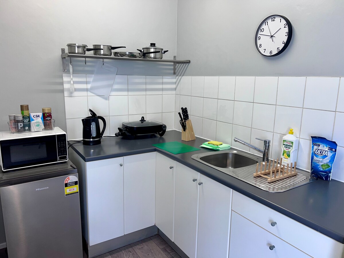 The Little Scandi Studio is modern, bright and clean. A little bit of Luxury and privacy in the suburbs. The Little Scandi Studio is one room 14.2sqm there is a large Queen bed a fully equipped kitchenette and modern bright separate bathroom. The Little Scandi Studio has a small outdoor deck a BBQ with table and 2 chairs contained in a secure courtyard. Which also has a washing machine.