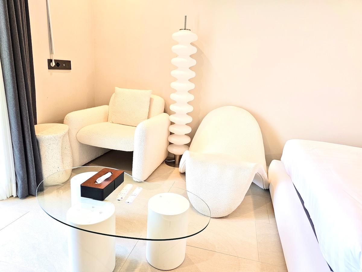 🥭C'est Mangone. La seule chambre pour 4 personnes Le bar-terrasse offrira aux clients la meilleure vue sur l'océan🏖️ et🧋 le lieu de dégustation de thé le plus délicieux. La plage est à 10 secondes du hall de l'immeuble,🏝️ et il y a des magasins de proximité à côté de l'immeuble. Il s'agit d'une chambre double avec un lit king size dans la première chambre et un lit queen size dans la deuxième chambre, ainsi qu'un grand lit premium🛏️ pour un sommeil confortable.💟 Dans le salon, il y a une table à manger🍽️ pour 4 personnes Thé et collations, vin, whisky, etc. Disponible (vin. whisky. verre de soju) est prêt. Les ustensiles de cuisine sont prêts. Les choses qui ne sont pas possibles Griller de la viande (viande crue) La viande grillée est possible. Poisson maeuntang, crabe, etc. L'odeur de poisson ne disparaît pas. Nous vous prions de bien vouloir comprendre que cela n'est pas possible pour les clients Toute la chambre a une vue sur l'océan et vous pouvez également profiter de la vue sur l'océan depuis la fenêtre du salon à la table🌊 à manger~ Le lever du soleil🌅 peut être apprécié depuis le salon de la première chambre sur la terrasse de la chambre. Alors je vous verrai bientôt🙏🏻