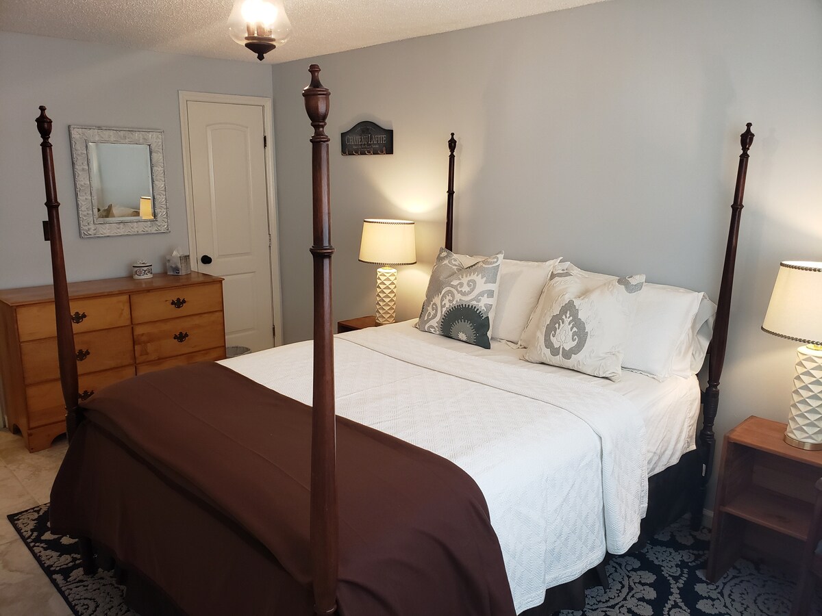 Proche de l'aéroport et du centre-ville d'Asheville, il s'agit d'une suite privée de chambres au rez-de-chaussée avec une entrée privée par le garage et beaucoup d'espace. Il y a un coin salon/TV, un coin repas avec kitchenette, une chambre queen confortable et une salle de bain complète. À dix minutes de l'aéroport et à 20 minutes du centre d'Asheville, la maison est située dans un charmant cadre de banlieue à proximité des restaurants et de tout ce que la région a à offrir.