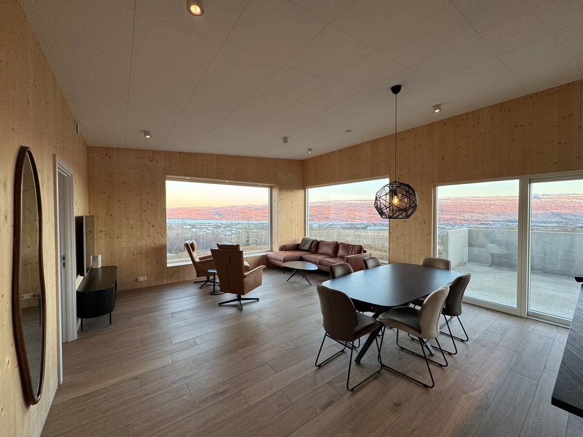 Ce chalet privé et luxueux est situé au-dessus d'Akureyri et offre une vue imprenable sur la ville, le fjord et les montagnes. À seulement quelques minutes du centre-ville. Trois chambres, une avec lit double et les autres avec deux lits simples. Cuisine moderne et spacieuse et salon avec grandes fenêtres. Deux salles de bains et buanderie avec lave-linge et sèche-linge. Jacuzzi à l'intérieur avec une grande porte donnant sur le balcon. Meubles de jardin et barbecue sur le balcon. Aurores boréales et « ski out » pendant l'hiver.
