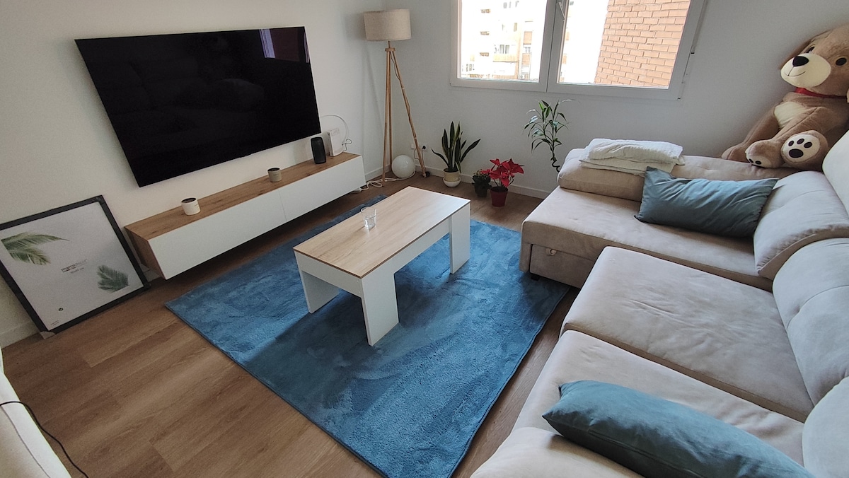 Notre maison est située dans un quartier résidentiel très tranquile ●● CLIMATISÉ ●● ● à 5 minutes en voiture du centre d'expositions IFEMA ● à 10 minutes en voiture de l'AÉROPORT ● à moins de 10 minutes en voiture du stade METROPOLITANO Situé au premier étage d'un immeuble résidentiel de 2 étages, appartement de 65m², lumineux et très calme. WiFi inclus. Stationnement gratuit sur la rue. Appartement avec 1 chambre et 1 grand salon avec porte coulissante qui se transforme en chambre séparée.