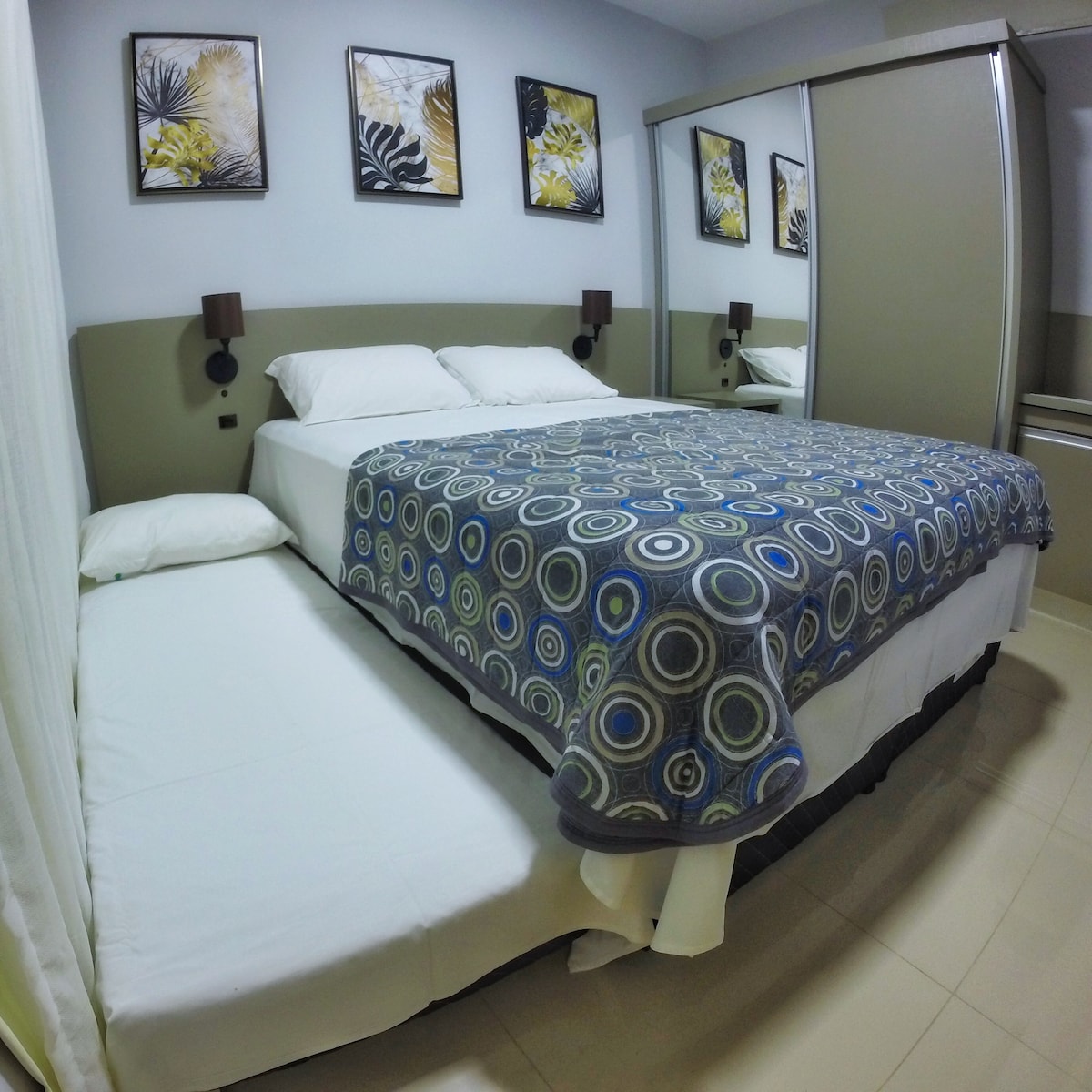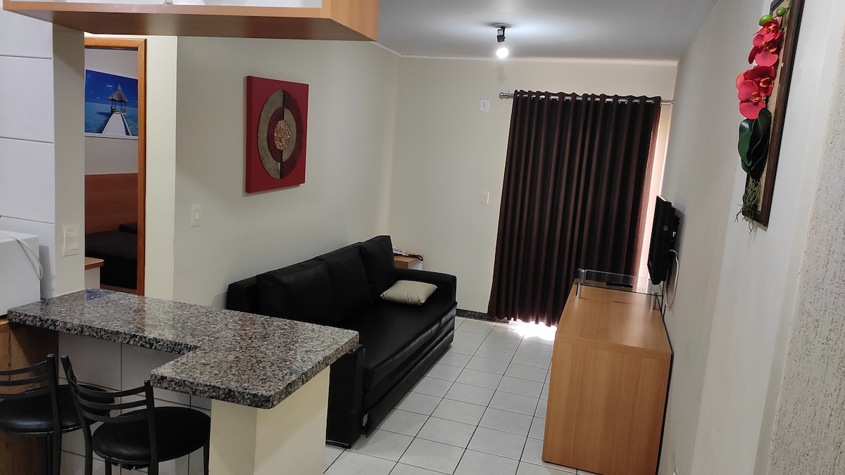 Cet appartement est situé à l'Hôtel Luppi (Appartement 1), il dispose d'une chambre avec un lit king size et un canapé-lit dans le salon. Il est nécessaire d'apporter du linge de lit, des serviettes de bain, des tapis de bain et un torchon. L'hôtel est proche du Hot Park, mais ceux qui y séjournent n'ont pas accès gratuitement au hot park ou au parque das fontes. Il est idéal pour un couple ou les petites familles. Il dispose de deux piscines chauffées et d'une petite froide avec cascade. La télévision, les climatiseurs et le micro-ondes sont neufs.