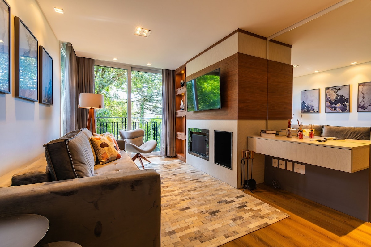 Appartement duplex avec une décoration charmante et confortable, il rappelle parfaitement le climat agréable de Gramado. Situé dans l'un des quartiers les plus nobles de la ville, à proximité du centre et des principaux sites touristiques. Il dispose du wifi, d'une télévision intelligente, du chauffage au gaz, d'une cheminée, d'un lave-linge/sèche-linge, de la climatisation portable, d'une cuisine complète, d'un lit et d'une salle de bain, d'un garage. Tout de bonne qualité, dans un endroit calme et boisé, parfait pour les familles à la recherche de confort et de tranquillité.