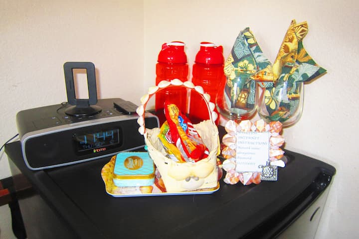Profitez d'une chambre privée avec salle de bain privée avec bain à remous, draps à haute densité, couettes en duvet alternatif, oreillers confortables, serviettes moelleuses, peignoirs luxueux, sèche-cheveux, fer à repasser, serviettes de plage, tapis de plage et produits de première nécessité. Réfrigérateur dans la chambre, connexion Wi-Fi gratuite et câble, rideaux occultants pour un sommeil et une intimité parfaits, télévision à écran plat et lecteur DVD, radio-réveil iPod, articles de toilette d'aromathérapie, chocolats belges et plus encore. Les invités ont accès à des chaises longues, des parasols, des chapeaux de soleil, des bâtons de marche, ainsi qu'à une tablette Android, un espace de travail et une imprimante.