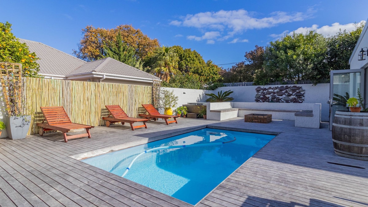 Ce chalet moderne et spacieux offre tout ce dont vous avez besoin pour des vacances parfaites ou une escapade rapide. Superbe jardin avec piscine. Salle de braai intérieure/extérieure avec salle à manger et mobilier de salon. Cuisine entièrement équipée avec cuisinière intégrée moderne, Nespresso, machine à café, lave-vaisselle, lave-linge et sèche-linge. Chambre avec lit queen size, de grands placards intégrés et une salle de bain attenante. Salon confortable. Grande télévision connectée, utilisez vos propres applications de streaming. Wifi rapide. À moins de 1 km du centre-ville et du sentier de la falaise.