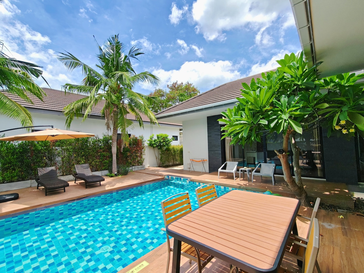Villa HuaHin avec 3 chambres, piscine et jardin, emplacement idéal, à 4-5 minutes en voiture du centre commercial, de la plage et du marché nocturne