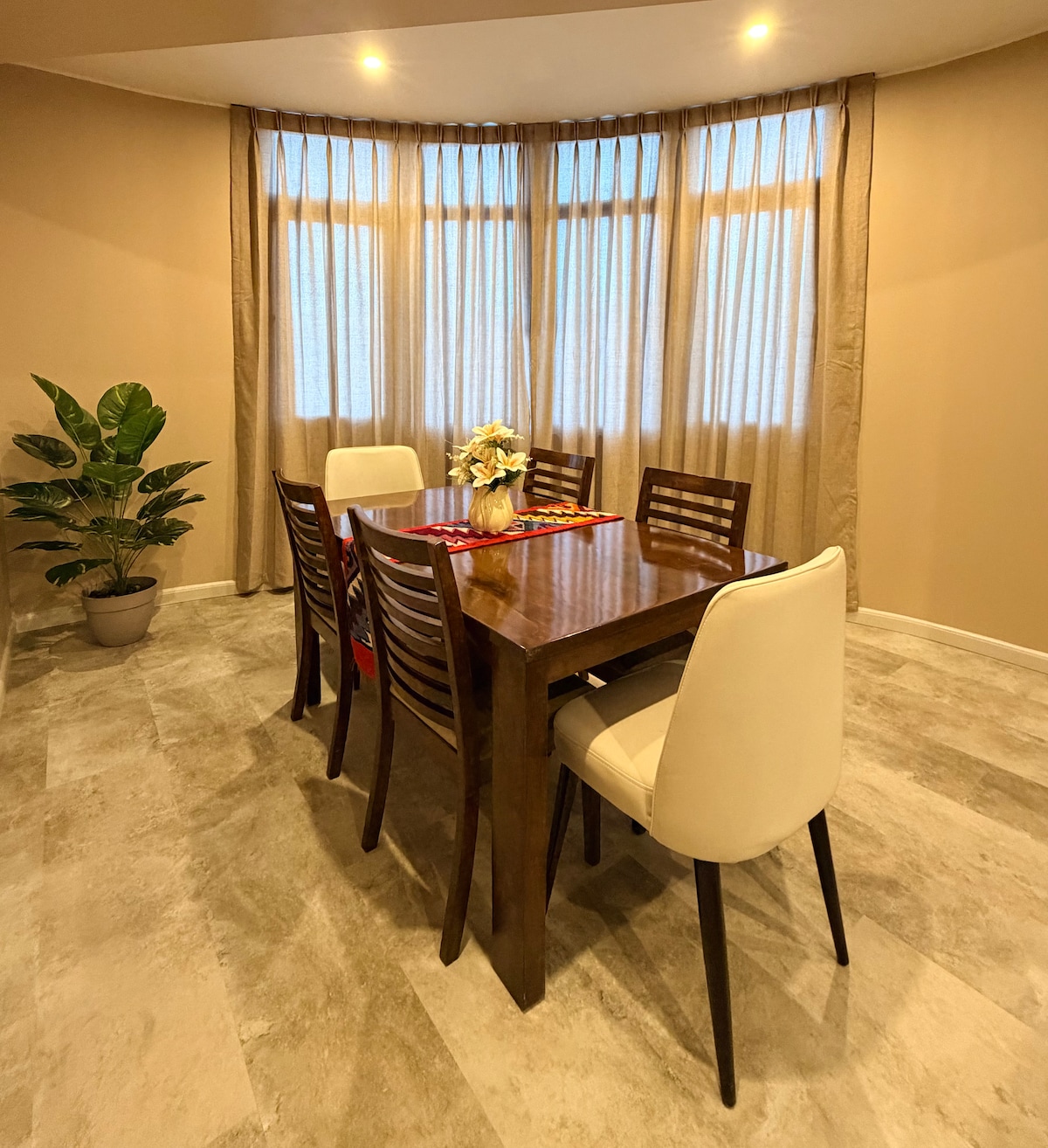 L'appartement est situé au cinquième étage avec vue extérieure avec balcon, d'un immeuble de 6 niveaux La chambre dispose d'un lit de deux places. salle de bain privée avec shampoing et après-shampoing Salle spacieuse S-Mart TV 55”+ salle de bain complète Cuisine américaine ouverte Salle à manger spacieuse. Balcon Entrée indépendante Eau chaude 24 heures sur 24 Wifi Parking couvert gratuit. Connexion Internet par fibre optique Les services que nous fournissons sont de niveau hôtelier