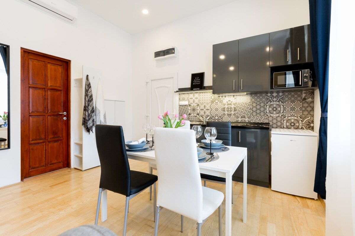 Ce studio moderne récemment rénové a été soigneusement conçu pour créer l'espace parfait pour les voyageurs d'aujourd 'hui. Le design minimaliste offre un espace confortable pour se détendre après une journée mémorable dans notre ville historique. Tous les voyageurs seront accueillis avec une bonne bouteille de vin hongrois. L'appartement est situé au 5e étage, l'ascenseur va jusqu'au 3e étage, vous devez donc monter 2 niveaux dans un escalier étroit. Débit Internet : 250 Mbit/s