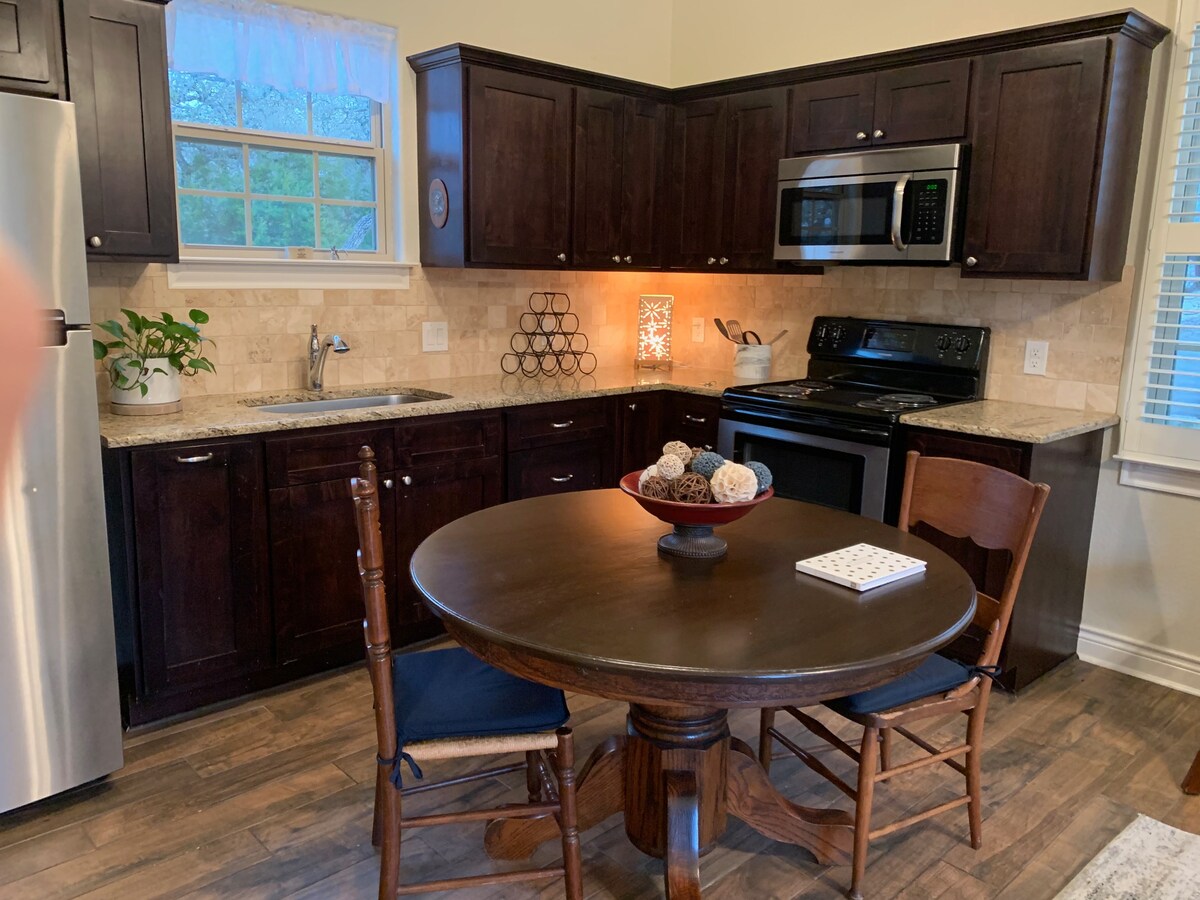 Profitez d'une vue paisible sur la forêt depuis votre porche arrière privé et votre bar vitrine, nichés sur une colline boisée près d'Alligator Creek. Il s'agit d'une suite privée au premier étage dans une maison d'hôtes de style duplex (pas une maison partagée) avec sa propre entrée, son porche et son parking. Pas d'espaces intérieurs partagés. Gruene Hall : 2 miles Chandelier de Gruene : 2 miles Aéroport d'Austin : 62 km Aéroport de S. A. : 28 mi Schlitterbahn : 4 mi