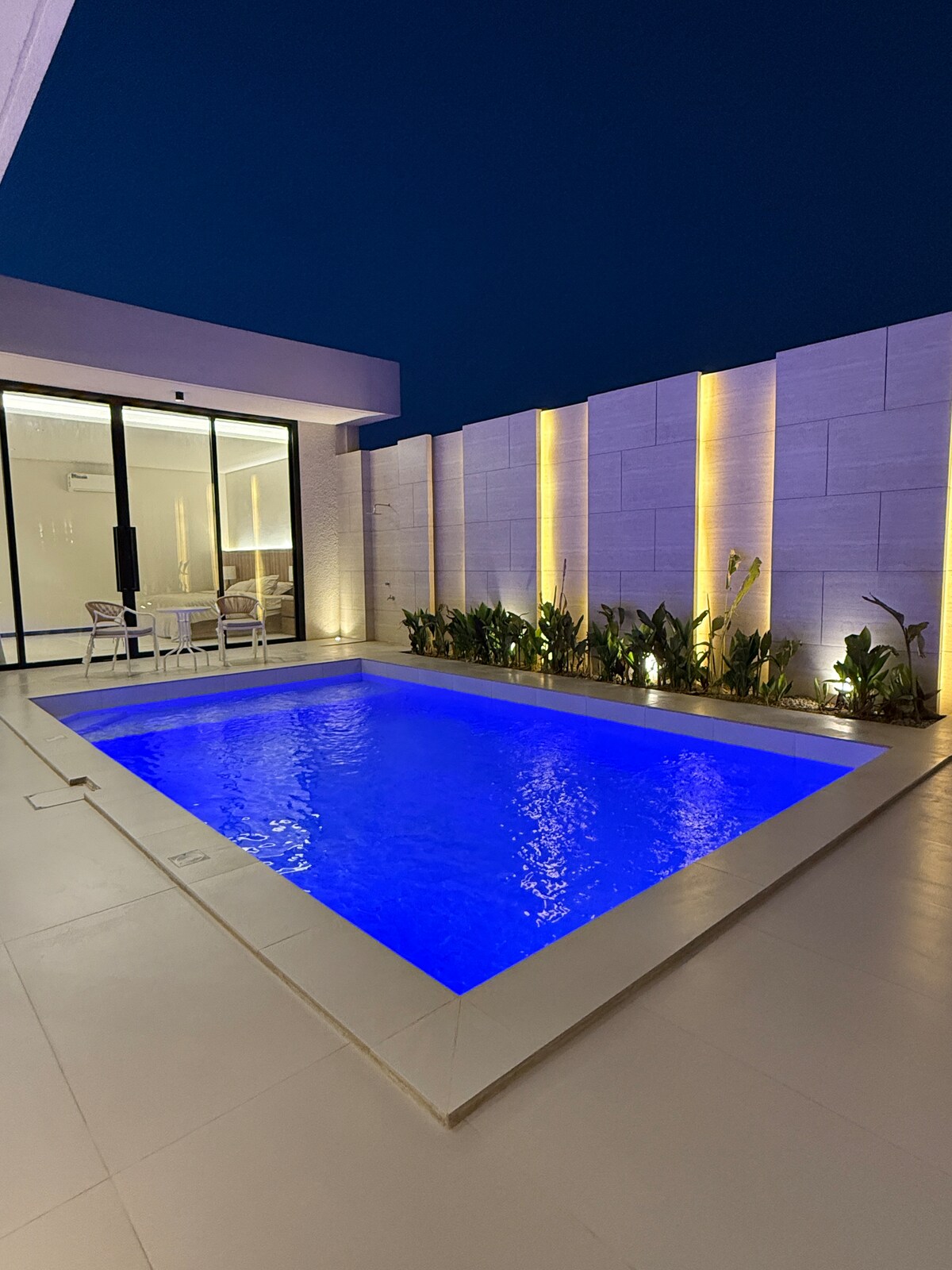 استمتع بإقامة ممتع شاليه فاخر يتكون من: •غرفتين نوم: غرفة نوم رئيسية: سرير كبير + دولاب + تسريحة غرفة نوم: سريرين مفرد + تسريحة •مجلس داخلي يتسع الى 13 شخص. •طاولة طعام •مطبخ مجهز •اله قهوة •حمامين. •مسبح خاص مساحة 6 متر✖️4متر •جلسة خارجية تتسع 10 اشخاص مطلة على المسبح والحديقة. •جلسة خارجية إضافية. •موقف سيارة خاص •مساحات خارجية ومنطقة فناء.