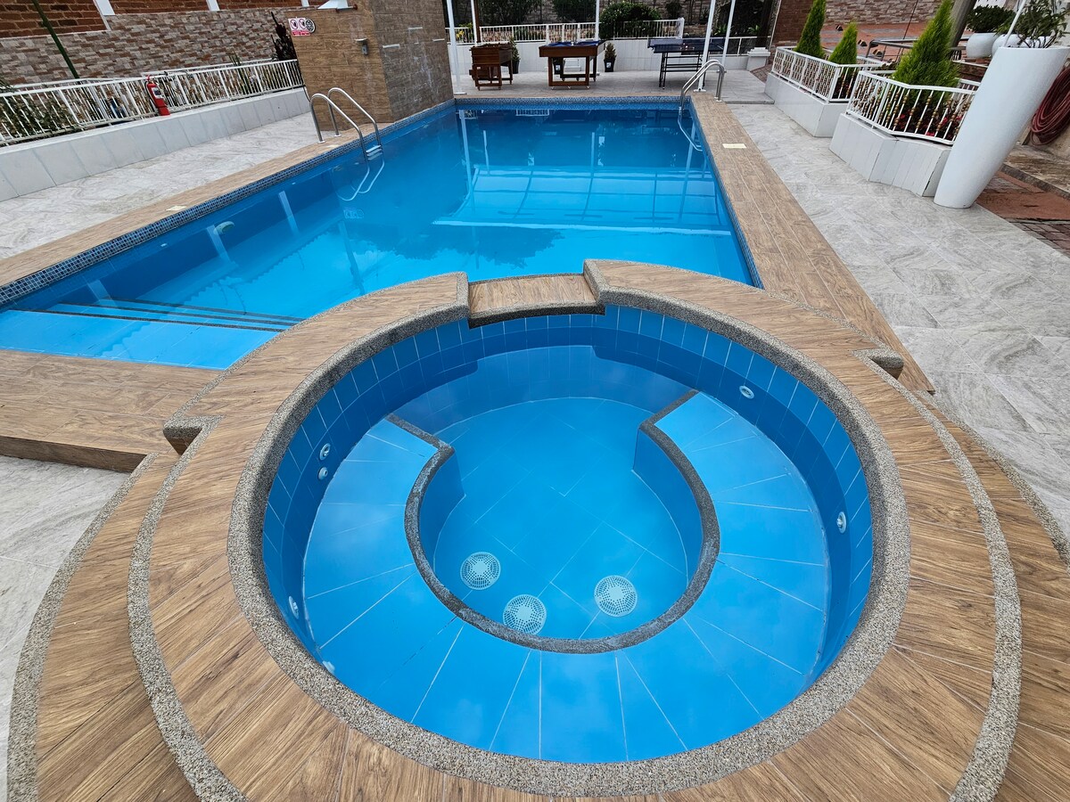 Te damos la bienvenida a tu exclusivo alojamiento ! Estamos ubicados frente al pulmón de la ciudad , a pocos metros del Río Tahuando y a 15 minutos del centro de Ibarra . Pueden hospedarse hasta 8 personas y disfrutar de hermosos jardines , aire puro y vistas privilegiadas , además una piscina temperada con paneles solares , turco,jacuzzi, área de parrillada, cocina , dos comedores , área de baile , fogata , vestidores , duchas , baños y gimnasio . Es el lugar que mereces disfrutar !