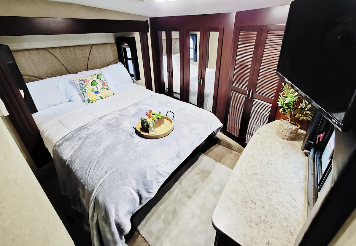 Petit camping-car avec lit double loft, cuisine, salle de bain et coin salon avec canapé convertible qui devient un lit court, table et TV Wi-Fi dédié à 50 mb/s. Idéal pour une personne, intime pour deux. Le chauffage s'adapte aux pieds. Climatisation qui va vous souffler les cheveux. La cuisine est équipée. Petite salle de bain : serviettes moelleuses, produits, douche. Le chauffe-eau à la demande offre beaucoup d'eau chaude. Animaux acceptés, frais de 3 $ . La piste cyclable va au centre-ville et à U of I. rv est proche d'un mini-mall, de Safeway et de films.