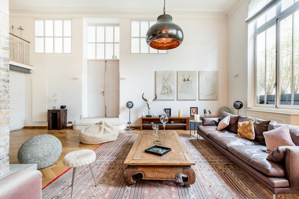 Bienvenue dans notre loft exceptionnel de plus de 300m², situé à proximité du Quartier Latin à Paris. Au rez-de-chaussée, profitez d'un salon spectaculaire de plus de 150m² avec plus de 5 mètres de hauteur sous plafond. Cet espace inclut une grande salle à manger pour 8 personnes, une cuisine ouverte avec bar, un autre salon TV, et un patio à ciel ouvert. Le tout est sublimé par un design unique, entouré d'œuvres d'art captivantes et de meubles haut de gamme.