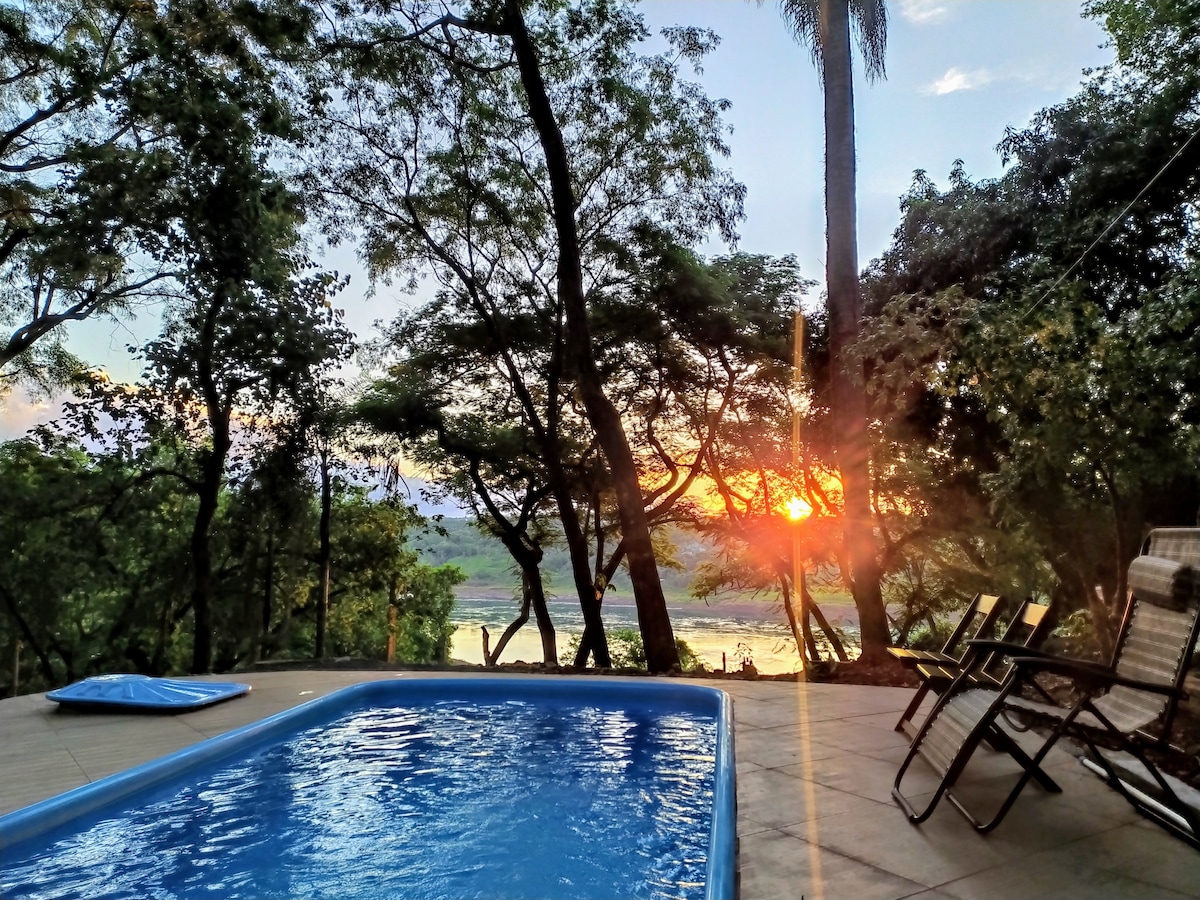 Maison entourée d'arbres, au milieu de la nature, face au fleuve Paraná, l'une des beautés de la ville, avec vue sur un magnifique coucher de soleil. Situé dans le centre, à 10 minutes à pied des principaux arrêts de bus, restaurants et avenues de la ville. Endroit calme et sûr. Maison avec télévision par câble, Internet gratuit, un salon spacieux avec télévision et de grands balcons pour un délicieux verre en fin d'après-midi.