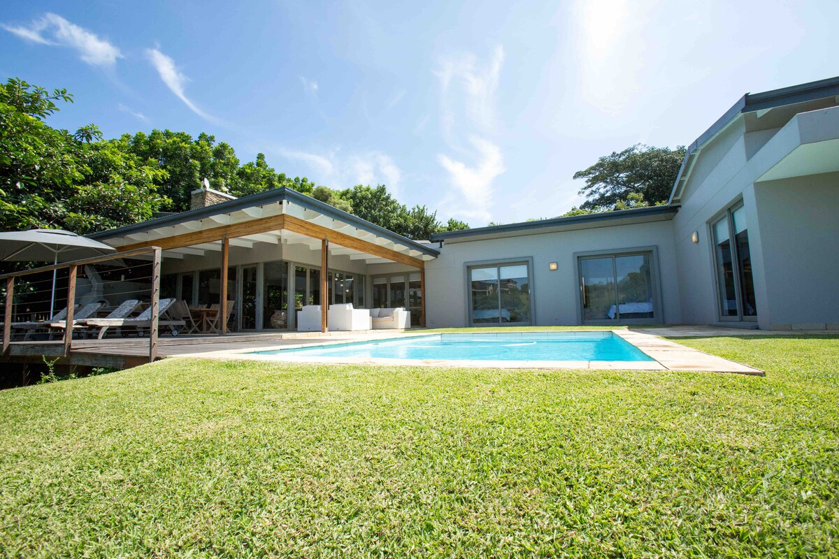 Maison familiale moderne, propre et spacieuse de 4 chambres donnant sur le barrage Wobler dans Simbithi Eco Estate. 7x 4 Chauffage solaire, Piscine chlorée au sel, Climatisation partout, Apple TV Netflix, Internet haut débit, Électricité de secours et four à pizza extérieur avec braai au gaz et foyer Lit King size (chambre principale) avec des lits queen size offrant un linge de maison frais blanc dans toutes les autres chambres. Deux salons avec TV à écran plat, une table à manger pour 8 personnes et une cuisine entièrement équipée.