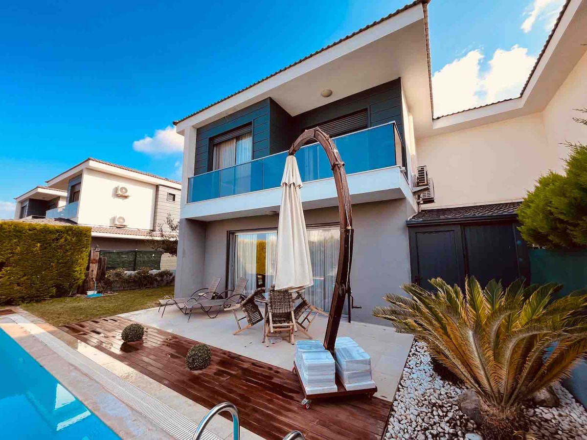 À Cesme Sifne, notre villa est située très près de la mer Ilica en voiture à seulement 5-10 min Alacati en voiture à seulement 10-15 min Marina de Cesme à seulement 20-25 min en voiture Monarch Beach Club à seulement 5 min Quente Beach Club à seulement 7 min Plage unique d'Ilica à seulement 5-7 min Salon et salle à manger ainsi qu'un jardin d'hiver où l'on peut ouvrir les portes vitrées, il y a aussi un espace jardin avec un barbecue. La piscine est une piscine privée qui appartient uniquement à cette villa