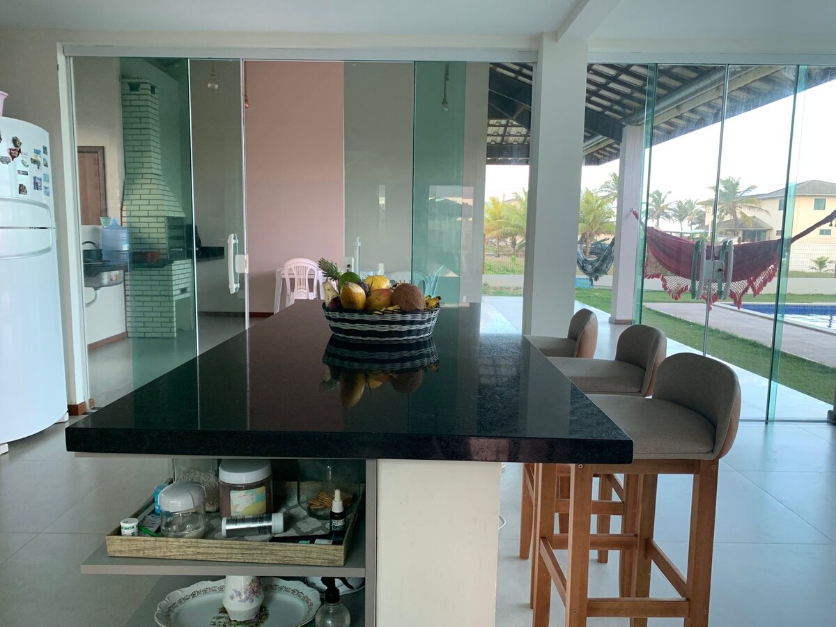 Un coin super agréable, dans une copropriété fermée. Maison très aérée et confortable avec : - 3 chambres avec climatisation - 3 salles de bains - Douche - Grand espace extérieur boisé - Grand balcon, barbecue, brasserie - Piscine - Internet haut débit En voiture, vous êtes à : 45 minutes de Salvador; 30 minutes de l'aéroport; 5 minutes de la plage paradisiaque de Canto do Sol; 10 minutes de la plage de Guarajuba; 17 minutes de Praia do Forte. Et très proche d'autres belles villes de la côte nord de Bahia.