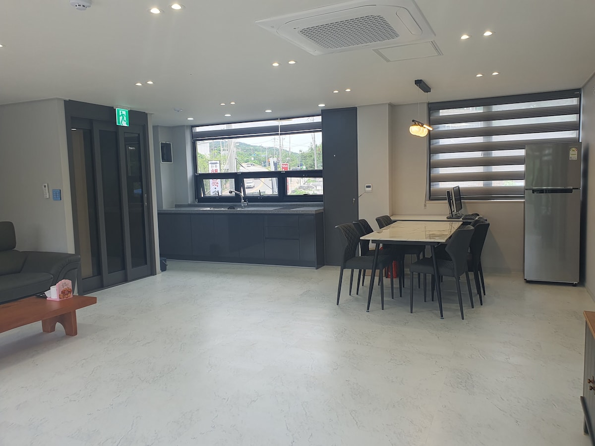 Hébergement pour 6 à 18 personnes C'est une grande pension privée adaptée aux grandes familles ou aux équipes multiples, ateliers d'entreprise, etc. Situé juste en face de la mer. La mer panoramique, les couchers de soleil magnifiques le soir et la vue sur le pont Gyodong sont également les meilleurs. Le barbecue est un espace indépendant, offrant un confort illimité à votre environnement.