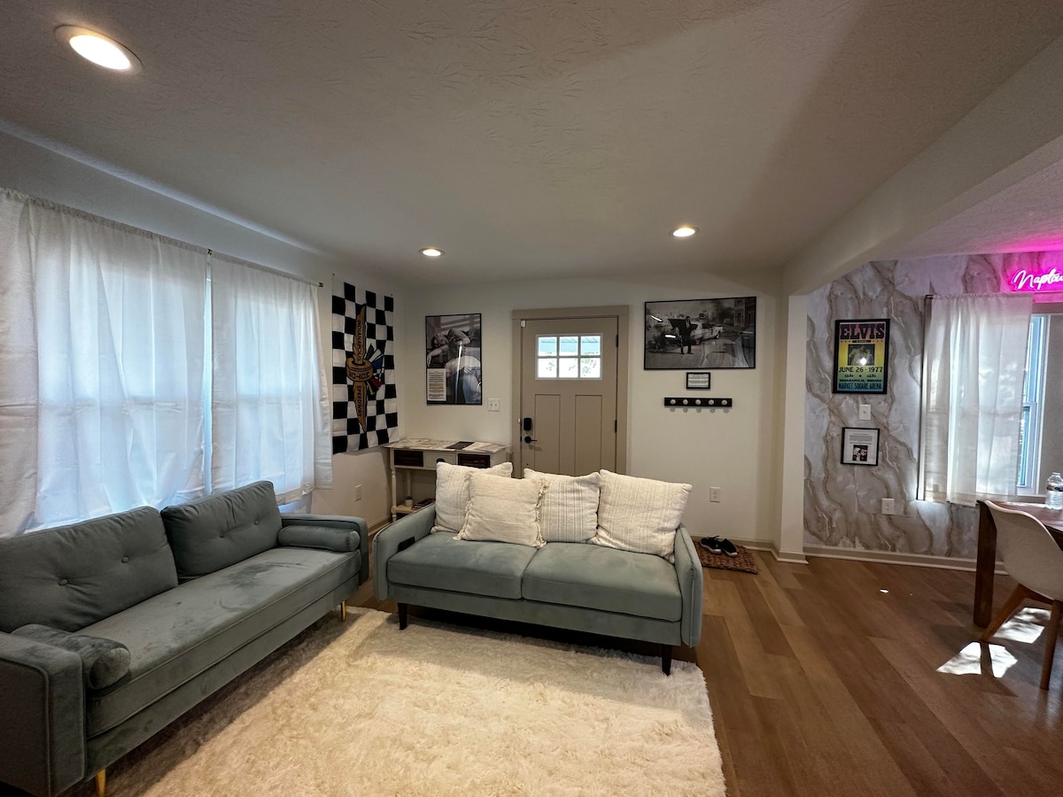 • Restaurants/bars accessibles à la marche • Lucas Oil Stadium, Convention Center et Pacers Center à 25 minutes • Terrains de foires d'État à moins de 15 minutes de la maison • Table de ping-pong, basket-ball, shuffleboard • Salle de blanchisserie gratuite • Superbe patio avant pour admirer le coucher du soleil • Firepit dans l'arrière-cour • Cuisine entièrement équipée ; • Quartier sûr. • Variété d'églises à proximité • Netflix inclus • Envoyez-nous un message aujourd'hui !