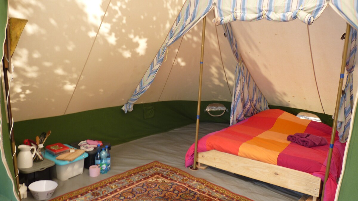 Tente très spacieuse (de waard) avec lit fixe, coin cuisine, table, chaises et deux chaises longues. La tente est située dans un endroit calme sur notre mini camping (6 emplacements) le petit pâtural. Dans l'écurie, nous avons deux toilettes et deux douches pour nos invités. Nous avons également des toilettes sèches. Le nombre maximum de personnes dans la tente est de 4.