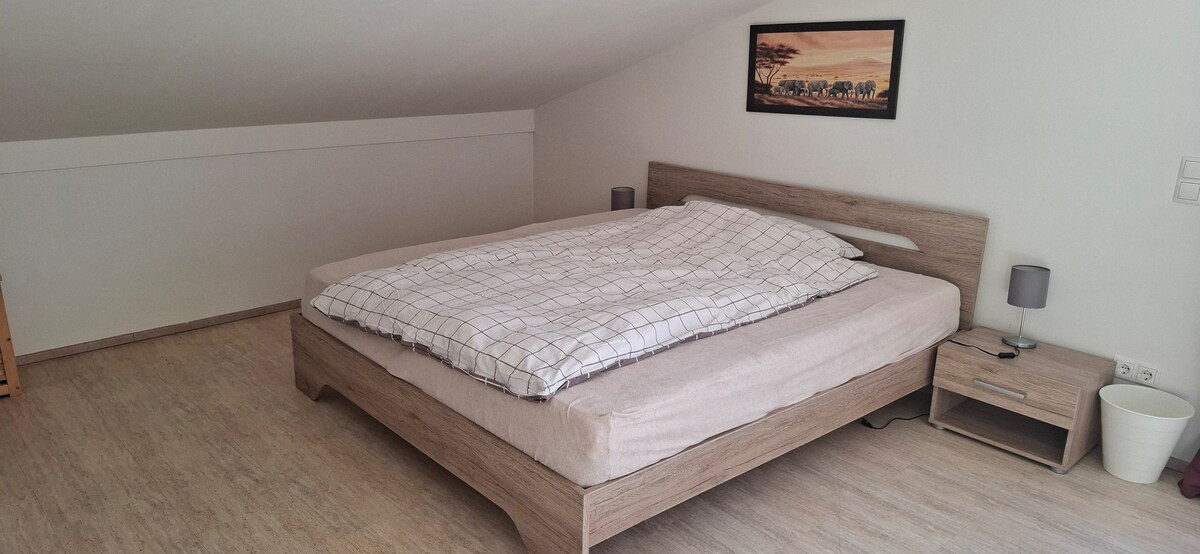L'appartement baigné de lumière se trouve au dernier étage de notre maison (1er étage). Il a été nouvellement construit en 2020 et offre beaucoup d'espace pour rester avec ses 100 m2. Sur la grande loggia, vous pouvez vous asseoir au soleil du soir ou prendre le petit déjeuner à l'extérieur. Un lave-linge et un sèche-linge peuvent être utilisés dans le sous-sol.