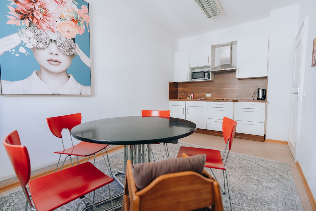 L'appartement se trouve au deuxième étage, dans une maison de ville classée. L'appartement est décoré dans un design rétro avec de nombreuses fenêtres, plafonds, portes, murs... Proche de la piscine extérieure et intérieure, du parc (ceinture verte qui fait le tour de la vieille ville) et bien sûr de la vieille ville avec commerces, cafés, bars, musées (médecine et musée d'art concret). L'usine Audi AG n'est pas loin. Le client est accueilli et guidé, aide possible à tout moment depuis les chambres voisines.