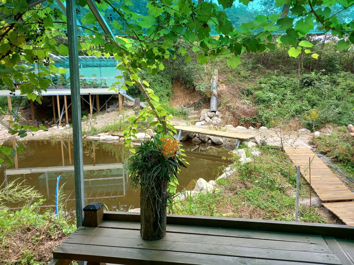 Bienvenue. Hwasumok Stay est un hébergement situé dans le village de Ji-ryu, au bord de la rivière Bukhan, à Seomyeon, Chuncheon-si. Hwasumok Stay est un hébergement entouré de fleurs, d'eau et d'arbres. Vous pouvez utiliser une annexe indépendante d'une maison de campagne où l'hôte réside. Vous pourrez profiter de la riche phytocène de la forêt autour de la propriété et d'un environnement rural très calme. Vous pourrez vous détendre dans un hébergement entièrement privé et disposer d'une terrasse de barbecue agréable. Et comme il y a aussi un poêle à bois, vous pouvez profiter d'un feu agréable, et des légumes frais et variés de la cour peuvent également être fournis lorsque la saison le permet. Il y a une machine Nespresso, et nous fournissons des capsules de café et des glaçons. L'hôte peut communiquer en anglais et vous pouvez faire l'expérience de la fabrication de planches à découper en bois de placage à l'atelier de bois de fleurs géré par l'hôte.