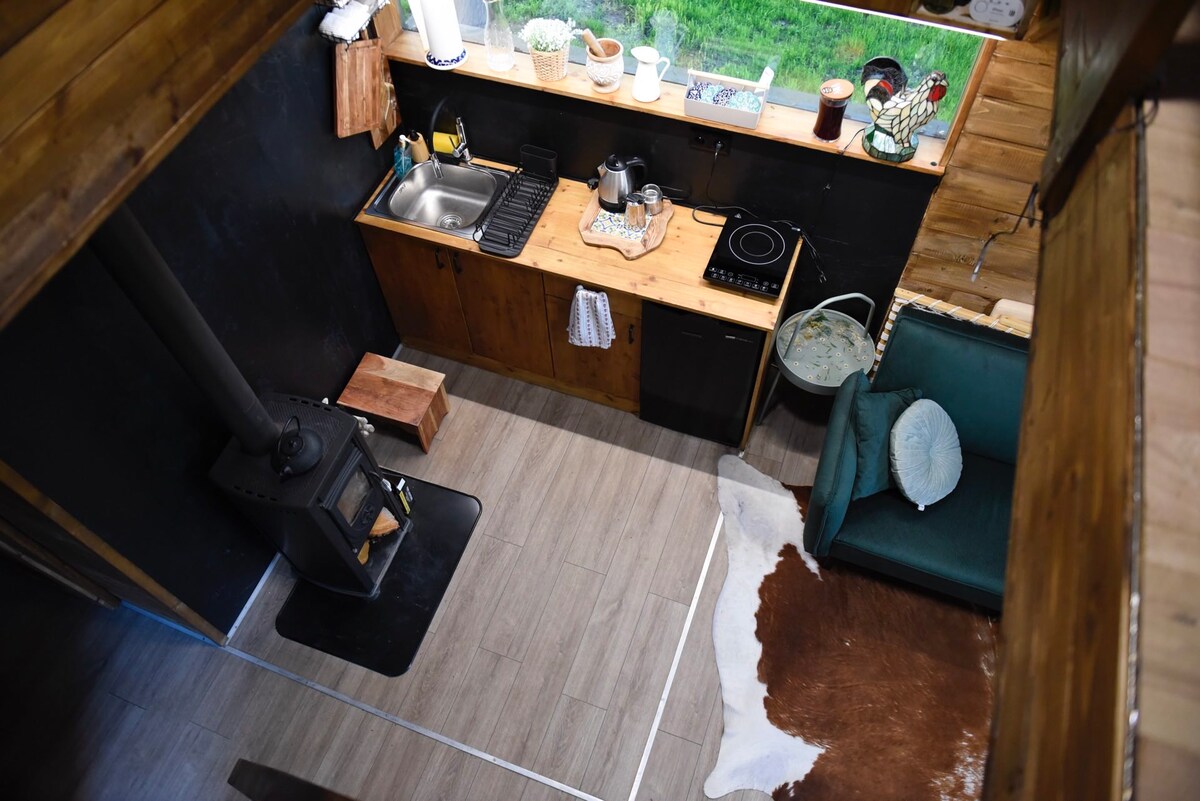 Ce cottage de style américain construit en 2025 est vraiment spécial. Il est situé directement sur un étang dans lequel, en plus de la carpe koi, de nombreux oiseaux sont actifs. Le bâtiment des toilettes et de la douche est juste à côté, mais c'est un bâtiment séparé, ce qui est agréable si vous êtes avec plusieurs invités. L'eau de la douche est chauffée électriquement. Le chauffage et la climatisation sont effectués au moyen d'une pompe à chaleur. La grande fenêtre panoramique offre non seulement une belle vue sur l'étang, mais aussi sur la campagne qui l'entoure.