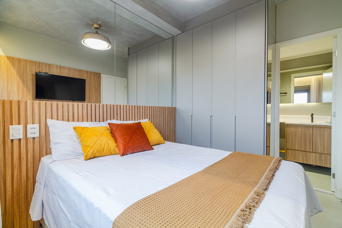 Appartement tout neuf, de style contemporain, de haut niveau et très bien situé, avec une vue privilégiée sur Allianz Parque. À côté des centres commerciaux, de diverses entreprises, des moyens de transport, des parcs, des attractions touristiques et des bâtiments d'affaires. Le studio est complet, avec un lit queen size confortable, une télévision connectée et Internet. Cuisine avec tous les ustensiles, plaque de cuisson, réfrigérateur et micro-ondes. Avec parking (rotatif). Proche de tout, confortable, parfait pour vivre des moments fantastiques.