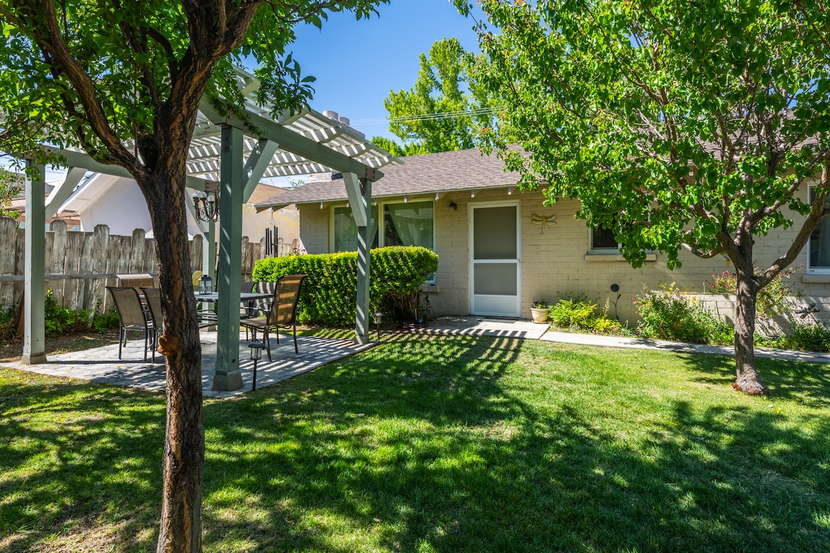 Détendez-vous sur le patio de cette maison d'hôtes d'une chambre récemment rénovée. Asseyez-vous près des étangs et nourrissez les canards et regardez les grosses truites nager. Profitez des fleurs dans le magnifique jardin ou servez-vous des fruits et légumes de saison. Emplacement idéal comme camp de base pour vos aventures dans l'est de la Sierra. À moins de 20 minutes en voiture, vous pourriez pêcher dans l'un de nos nombreux lacs ou au point de départ d'une nouvelle aventure. Entrée privée et parking avec une cuisine équipée. Autorisation de location courte durée n° 000179