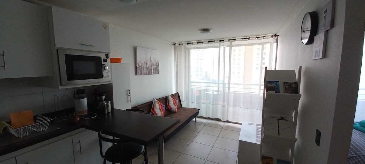 Appartement confortable au 9e étage avec une large vue sur la ville, vous offre un excellent emplacement à quelques pas du centre-ville, de la promenade piétonne appelée Baquedano, Balmaceda aussi, et de la plage de Cavancha, pour rendre votre séjour agréable et mémorable, si vous venez dans notre ville pour des raisons professionnelles ou simplement pour des vacances. Bienvenue, profitez-en !