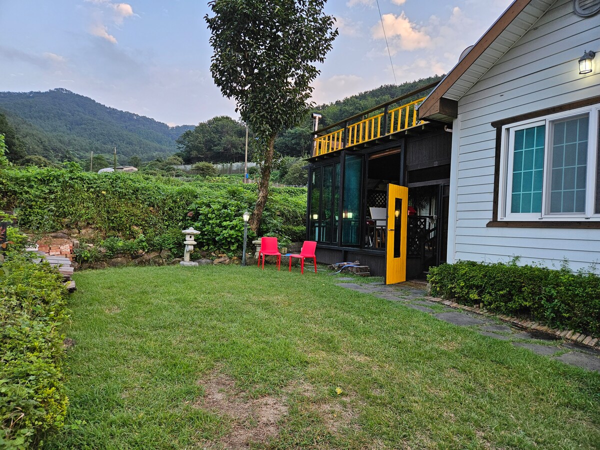 Situé au pied de la montagne au-dessus du village de Geurim, dans la commune de Dundeok, il offre un air pur et une vue fraîche, ainsi qu'une vaste pelouse et un potager où vous pouvez cueillir des légumes de saison respectueux de l'environnement. En été, vous pouvez vous rafraîchir dans la piscine extérieure du grand jardin, vous détendre dans un hamac entre les arbres et profiter du barbecue grillades de poitrine de porc. Je pense que c'est le meilleur endroit pour se détendre en famille. Dans les environs, le Dunn Duck Palace et le musée de littérature de Cheongma, qui conservent l'histoire et la culture.Il y a le Cheongnyeongjeong, le mont Sanbang et le sanctuaire de Sanbang que beaucoup de gens visitent, et les cosmos sont en pleine floraison à Cheongmadalnyeon à l'automne. Si vous venez ici, vous pouvez avoir un repos bien rempli avec la nature propre et guérir et visiter les sites touristiques à proximité. Vous pouvez toujours communiquer avec les clients par téléphone (010 3861 2415) et SMS