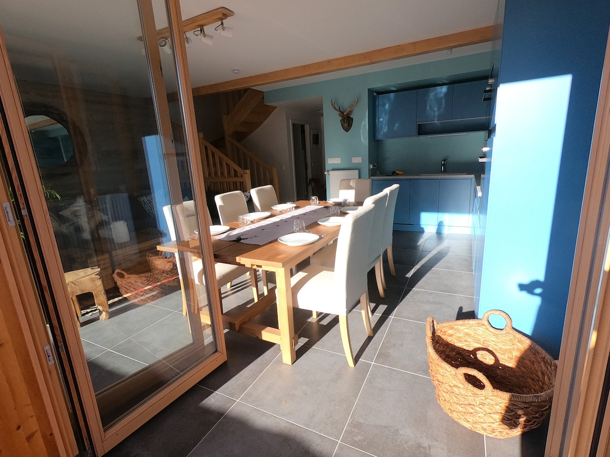 le chalet se trouve dans un secteur très calme entouré de bois avec des parcours de promenade dans la forêt à 200 mètres. Terrasse extérieur couverte avec canapé et fauteuil pour une bonne détente. Nous sommes à 45 min des premières stations de ski. Notre habitation se trouve à 10mètres donc nous serons vous conseiller si besoin et serons très réactifs en cas de problème. Tout est prévu pour que vous puissiez passer un bon séjour en toute tranquillité. Il ne reste plus qu’à réserver 😊