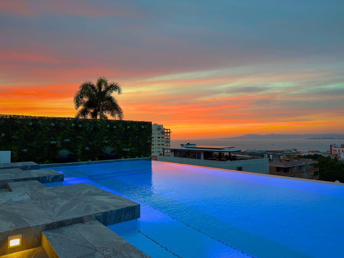 Ce logement d'angle d'une chambre dans la Zona Romántica avec balcon panoramique vous permet de profiter de la vie intérieure et extérieure avec des portes vitrées coulissantes entièrement rétractables. Équipé d'une cuisine complète, d'une machine Nespresso, d'une télévision, d'un Sonos, de stores occultants automatiques et d'un lit king size, le logement dispose de tout ce dont vous avez besoin pour profiter de votre séjour à PV. Les équipements du bâtiment comprennent une piscine sur le toit, un jacuzzi et une salle de sport avec vue sur l'océan. Veuillez noter qu'il y a des travaux de construction importants dans la Zona Romántica qui peuvent causer du bruit pendant la journée.