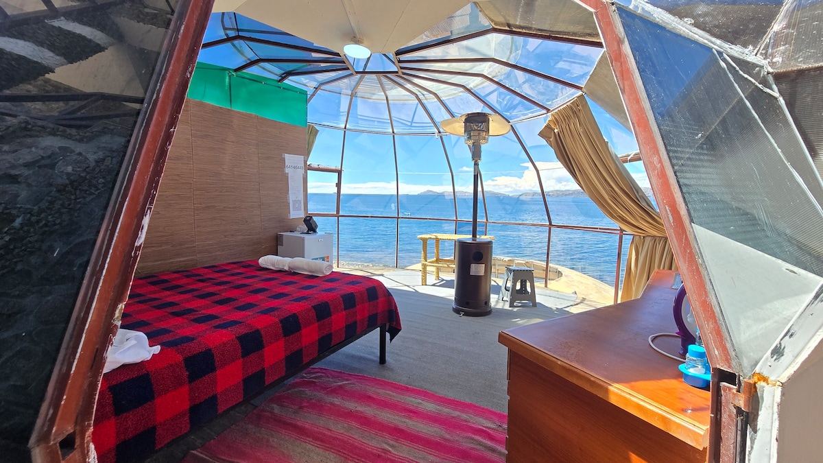Este lugar memorable es cualquier cosa menos común. Despierta flotando frente al Lago Titicaca Nuestros domos suspendidos ofrecen una experiencia incomparable: un espacio acogedor, moderno y elevado, similar a un teleférico privado, con una vista panorámica de 180° hacia uno de los paisajes más sagrados y hermosos de Bolivia, cada amanecer entra suavemente por los amplios ventanales, mientras el lago y las montañas te regalan un espectáculo natural imposible de olvidar. con jacuzzi y sauna
