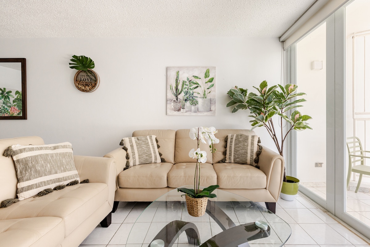 Profitez d'une expérience élégante dans cet hébergement central à seulement 7 minutes en voiture de l'aéroport SJU. Accès direct à la plage, parc passif, salle de sport, piscine, espace barbecue, terrain de basket, court de tennis, « loundromat » au premier niveau. Vous apprécierez votre café ou votre vin dans le fauteuil suspendu du balcon rustique-moderne confortable où vous pourrez apprécier la vue sur la plage et la ville. Suivez @buenavidabeachstudio