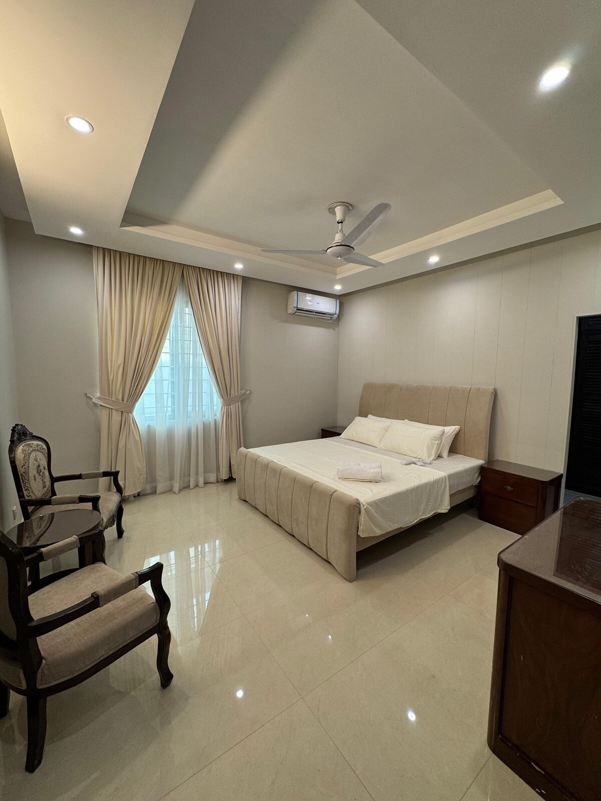 Havre de paix raffiné 2 chambres | 11 Central | Serrure numérique 🛏️ Deux lits King Size et balcon privé 🔐 Serrure connectée | Arrivée autonome 📺 Téléviseur connecté 65" et WiFi rapide (30 Mbps) 🍽️ Cuisine moderne entièrement équipée ❄️ Climatiseurs à onduleur et eau chaude 24h/24 et 7j/7 🪑 Intérieurs design et mobilier haut de gamme 🏔️ Margalla, coucher de soleil et vue sur la ville 🚗 Parking au sous-sol dédié 📍 Au cœur d’Islamabad | À 8 minutes du centre commercial Centaurus Idéal pour les cadres et les escapades urbaines exigeantes. Carte d'identité requise (18 ans et plus). Pas de fêtes. Il est permis de fumer uniquement sur le balcon. Réservez dès maintenant !