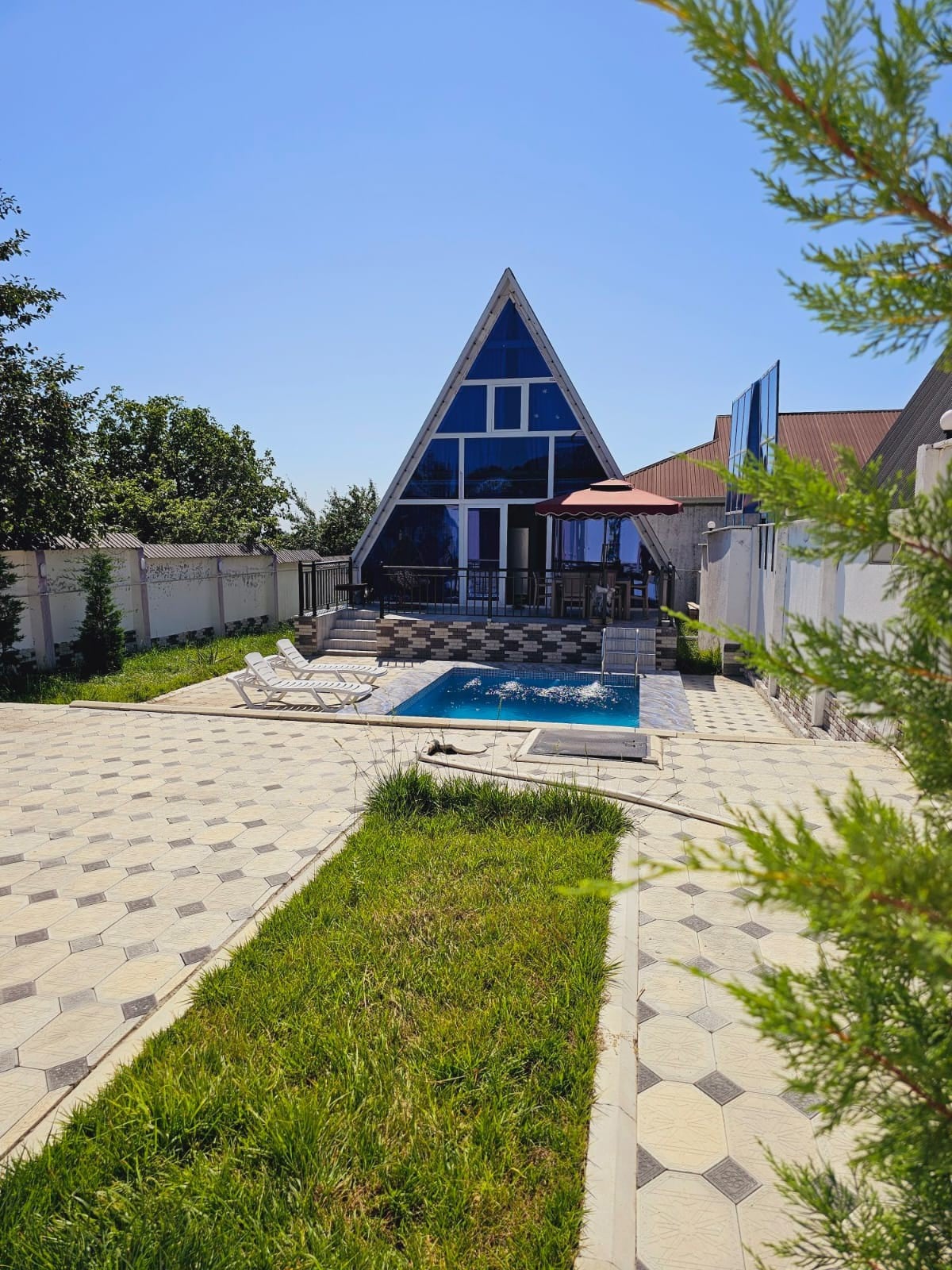 Cette maison en forme de A est située à Gabala, en Azerbaïdjan, à proximité de tous les principaux centres de loisirs et attractions tels que Tufandag, Gabaland, la cascade des sept beautés et le lac Nohur. Il offre toutes les commodités pour la détente, y compris une piscine chauffée, un jacuzzi, une PS5 et un baby-foot