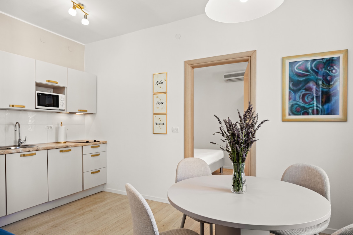 L'appartement conviendra pour une à cinq personnes. Il est bien équipé pour un séjour agréable. Il est situé au premier étage d'une maison familiale et se compose de deux chambres, d'une cuisine, d'un salon, d'une salle de bain avec un wc, d'un balcon, d'une véranda et d'un parking. L'appartement est équipé d'une cuisinière ( électricité), d'un hibou, d'un réfrigérateur, d'un four à micro-ondes, d'une machine à café, d'un téléviseur, d'une radio, d'une télévision par satellite, d'une connexion Internet sans fil, de la climatisation, du chauffage central, du linge de maison et des serviettes,lave-linge.
