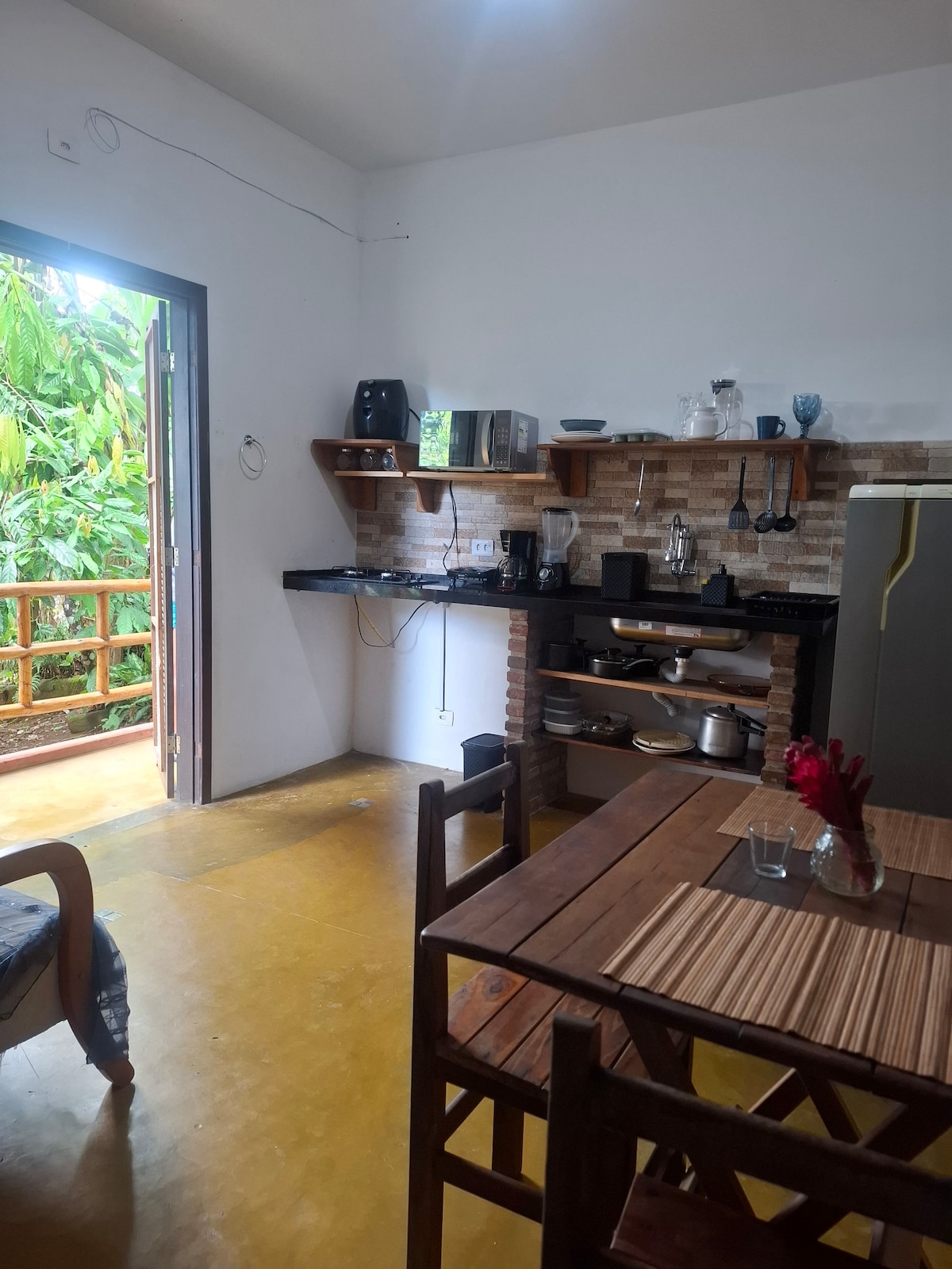 Um refúgio banhado pelo sol, com varanda aberta e vista para o mar. Acorde com o som dos pássaros, tome café com a brisa entrando pela porta e sinta que o tempo parou. Venha viver dias leves. Flat no andar térreo, na Mata Atlântica com uma linda vista para o mar e o Rio de Contas, um refúgio bem próximo do centro de Itacaré.