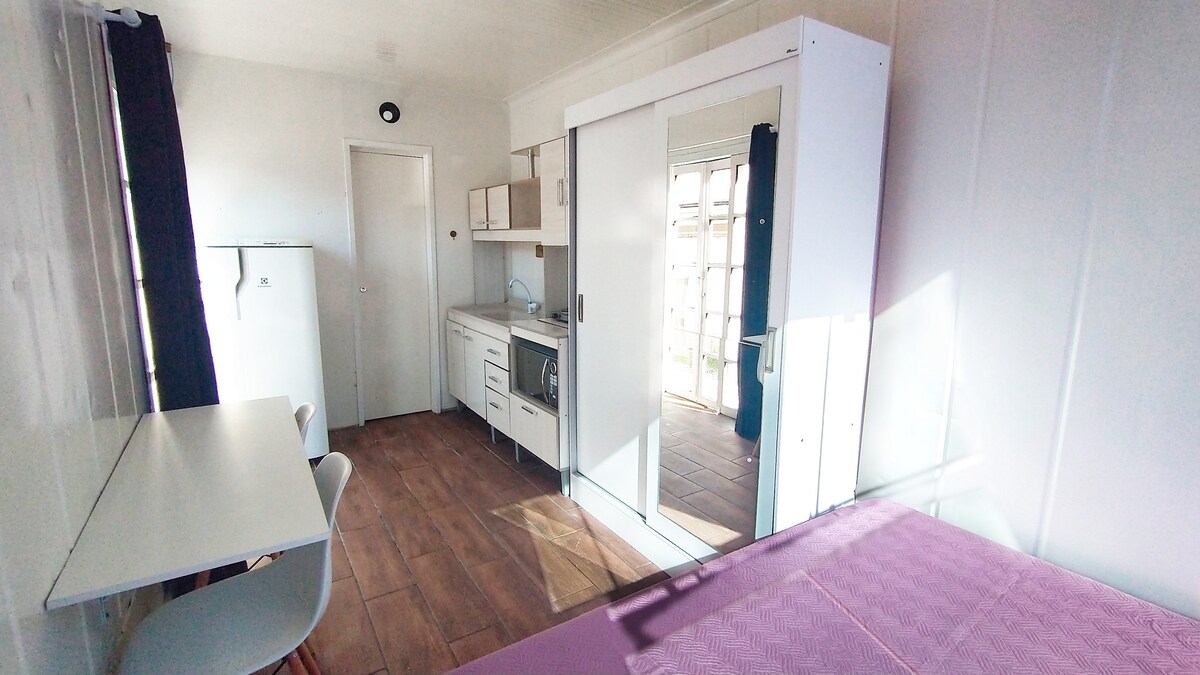 Kitnet para 3 pessoas feita em container frigorífico (com ISOLAMENTO TÉRMICO como uma casa comum) 1 cama de casal e 1 auxiliar de solteiro Andar TÉRREO Com vaga de garagem rotativa e Internet Wi-fi de 120mb Ideal para quem pretende curtir ao máximo a cidade e economizar na estadia Há 1000m da praia central . Rua silenciosa com comércio próximo e fácil acesso a avenida principais e Praia Brava. ****cada porta branca nas fotos corresponde a uma kitnet. São 6 ao todo.